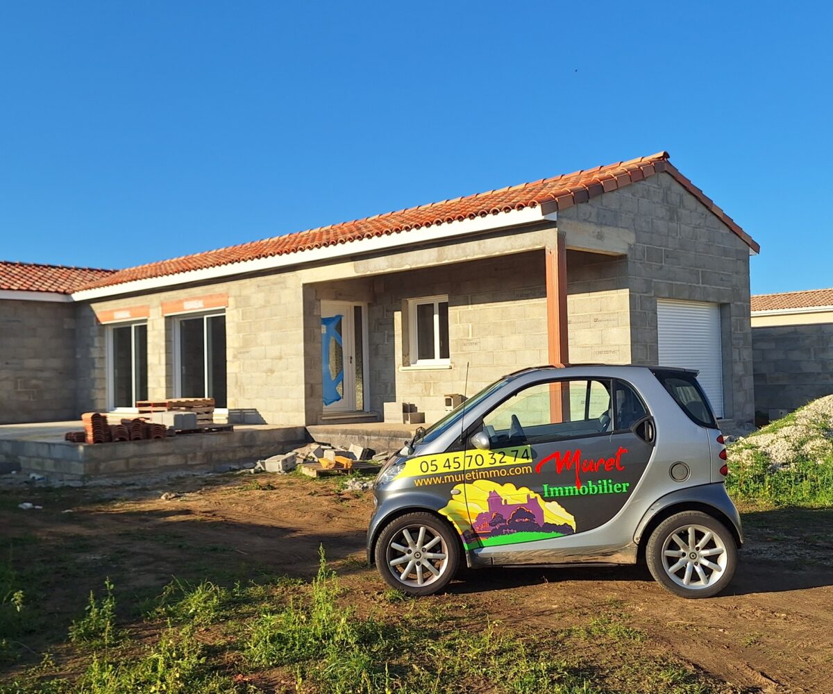 5 mns away La Rochefoucauld, very quiet location, full foot new bungalow under construction – delivered out of water – out of air – with placo – not crashed + attached garage 20 m2 and terrace 47 m2 – all on sewer –