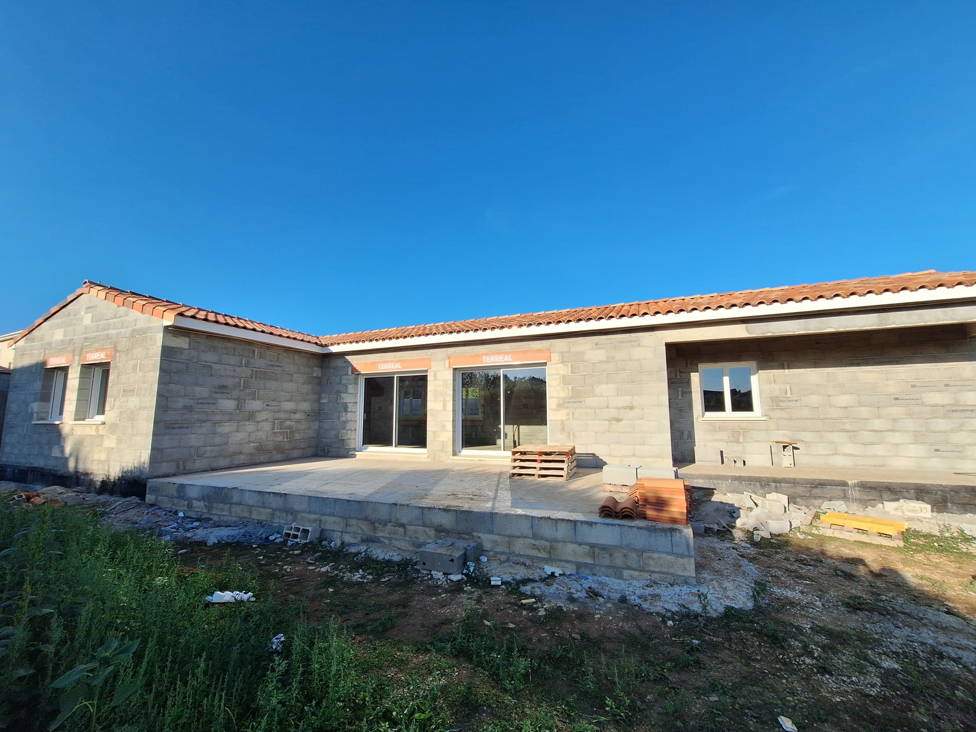 A 5 mns de La Rochefoucauld, au calme , pavillon de plain pied en cours de construction – 102 m² + le garage attenant 20 m² – terrasse 47 m² –
